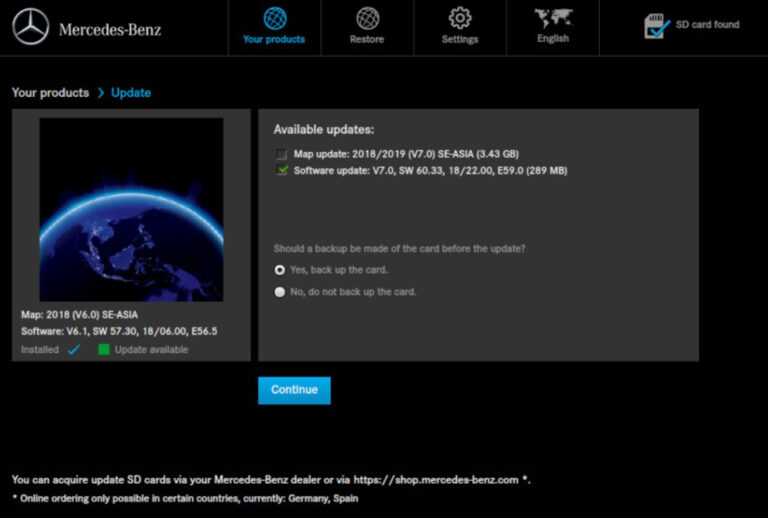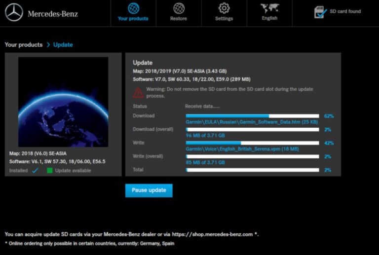 Schritt 3: Software-Update Stecken Sie die Kartenkarte in den SD-Kartenleser Ihres Computers und starten Sie den Mercedes-Benz Download Manager. Melden Sie sich mit „DLM“ als Benutzername und Passwort an. Wählen Sie „Software-Update“ und deaktivieren Sie „Karten-Update“. Erwägen Sie, für zusätzliche Sicherheit eine Sicherungskopie der Karte anzulegen. Das Software-Update dauert normalerweise 10–15 Minuten.